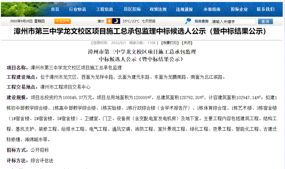 漳州市第三中学龙文校区项目施工总承包监理 中标候选人公示(暨中标结果公示)