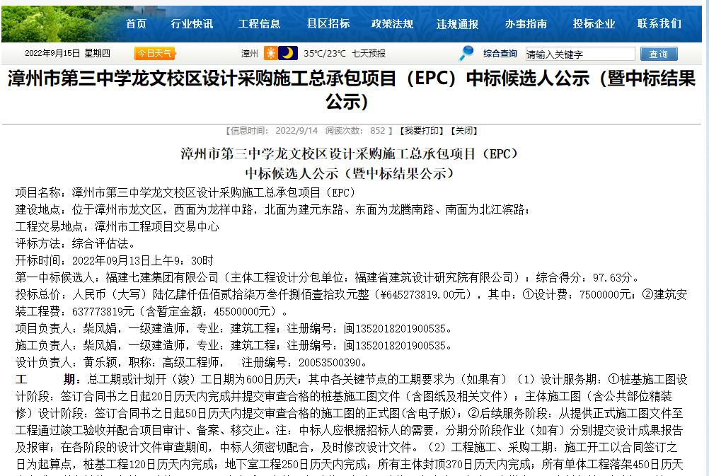 头条2:特房锦绣碧湖毛坯开盘市场反应冷淡 漳州市区教育圈再次传来利好,漳州市第三中学龙文校区自宣布落地龙文区后,项目的开工建设时间节点,一直牵动人心。 近日,漳州市工程项目交易中心连发《漳州市第三中学龙文校区设计采购施工总承包项目(EPC)中标候选人公示(暨中标结果公示)》、《漳州市第三中学龙文校区项目施工总承包监理中标候选人公示(暨中标结果公示)》等2则公示,漳州三中龙文校区离正式开工又近一步! 据公示显示:漳州市第三中学龙文校区的建设规模为,项目总投资约100849.37万元。项目总用地面积为120000㎡,总建筑面积128792.30㎡,计容建筑面积102947.14㎡;拟建1栋初中部教学综合楼、1栋高中部教学综合楼、1栋实验楼、1栋行政综合楼(含学术报告厅)、1栋体育综合馆、1栋艺术楼、3栋宿舍楼(1#宿舍楼、2#宿舍楼、3#宿舍楼)、卫健室、门卫、设备房(含变配电室发电机房)及地下室。 另据公示显示:项目总工期或计划开(竣)工日期为600日历天;其中各关键节点的工期要求为(如果有)(1)设计服务期:①桩基施工图设计阶段:签订合同书之日起20日历天内完成并提交审查合格的桩基施工图文件(含图纸及相关文件);主体施工图(含公共部位精装修)设计阶段:签订合同书之日起50日历天内提交审查合格的施工图的正式图(含电子版);②后续服务阶段:从提供正式施工图文件至工程通过竣工验收并配合项目审计、备案、移交止。注:中标人应根据招标人的需要,分期分阶段作业(如有)分别提交设计成果报告及报审;在各阶段的设计文件审查期间,中标人须密切配合,及时修改设计文件。(2)工程施工、采购工期:施工开工以合同签订之日为起算点,桩基工程120日历天内完成;地下室工程250日历天内完成;所有主体封顶370日历天内完成;所有单体工程落架450日历天内完成;所有单体工程竣工验收500日历天内完成;室外工程验收、各专项验收(含消防、人防、电梯专项、资料归档、规划)及竣工验收备案600日历天内完成。 值得一提的是,据此前媒体报道,漳州三中龙文校区将争取在下半年开工。按公示工期要求测算,只要在2022年下半年甚至年底前开工,那么,漳州三中龙文校区将有望在2024年秋季建成,甚至投用,这对于龙文区市民而言,是实打实的利好! 另关于项目的质量要求是:①设计要求的质量标准:设计文件必须符合有关部门制定的标准、规范、规程、定额、办法和发包人要求,并能通过相关行政主管部门及施工图审查机构审查。②施工要求的质量标准:必须达到现行《工程施工质量验收规范》合格标准及国家、行业及地方相关现行施工验收规范合格标准,同时达到省级“闽江杯”优质工程及以上标准。③采购质量标准:必须采购原产、正宗品牌设备或材料,采购的设备或材料必须符合发包人要求及有关部门制定的质量规范要求。 ![]() 项目名称:漳州市第三中学龙文校区设计采购施工总承包项目(EPC) 建设地点:位于漳州市龙文区,西面为龙祥中路,北面为建元东路、东面为龙腾南路、南面为北江滨路; 工程交易地点:漳州市工程项目交易中心 评标方法:综合评估法。 开标时间:2022年09月13日上午9:30时 第一中标候选人:福建七建集团有限公司(主体工程设计分包单位:福建省建筑设计研究院有限公司);综合得分:97.63分。 投标总价:人民币(大写)陆亿肆仟伍佰贰拾柒万叁仟捌佰壹拾玖元整(¥645273819.00元),其中:①设计费:7500000元;②建筑安装工程费:637773819元(含暂定金额:45500000元)。 项目负责人:柴风娟,一级建造师,专业:建筑工程;注册编号:闽1352018201900535。 施工负责人:柴风娟,一级建造师,专业:建筑工程;注册编号:闽1352018201900535。 设计负责人:黄乐颖,职称:高级工程师, 注册编号:20053500390。 工 期:总工期或计划开(竣)工日期为600日历天;其中各关键节点的工期要求为(如果有)(1)设计服务期:①桩基施工图设计阶段:签订合同书之日起20日历天内完成并提交审查合格的桩基施工图文件(含图纸及相关文件);主体施工图(含公共部位精装修)设计阶段:签订合同书之日起50日历天内提交审查合格的施工图的正式图(含电子版);②后续服务阶段:从提供正式施工图文件至工程通过竣工验收并配合项目审计、备案、移交止。注:中标人应根据招标人的需要,分期分阶段作业(如有)分别提交设计成果报告及报审;在各阶段的设计文件审查期间,中标人须密切配合,及时修改设计文件。(2)工程施工、采购工期:施工开工以合同签订之日为起算点,桩基工程120日历天内完成;地下室工程250日历天内完成;所有主体封顶370日历天内完成;所有单体工程落架450日历天内完成;所有单体工程竣工验收500日历天内完成;室外工程验收、各专项验收(含消防、人防、电梯专项、资料归档、规划)及竣工验收备案600日历天内完成。 质量要求:①设计要求的质量标准:设计文件必须符合有关部门制定的标准、规范、规程、定额、办法和发包人要求,并能通过相关行政主管部门及施工图审查机构审查。②施工要求的质量标准:必须达到现行《工程施工质量验收规范》合格标准及国家、行业及地方相关现行施工验收规范合格标准,同时达到省级“闽江杯”优质工程及以上标准。③采购质量标准:必须采购原产、正宗品牌设备或材料,采购的设备或材料必须符合发包人要求及有关部门制定的质量规范要求。 类似工程业绩:福建七建集