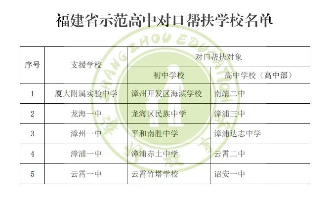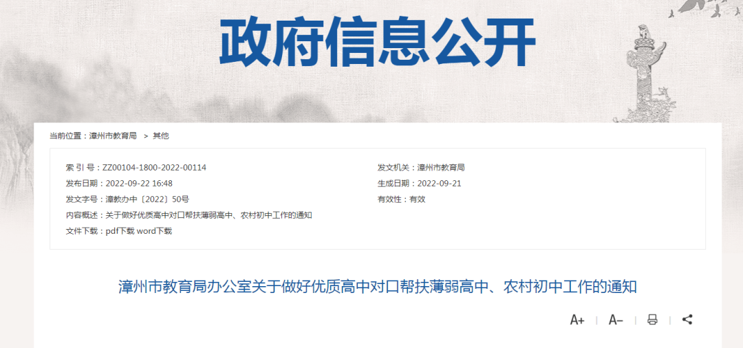 2022年9月22日,漳州市教育局发布《关于做好优质高中对口帮扶薄弱高中、农村初中工作的通知》。