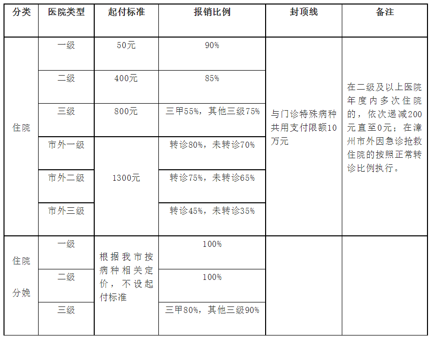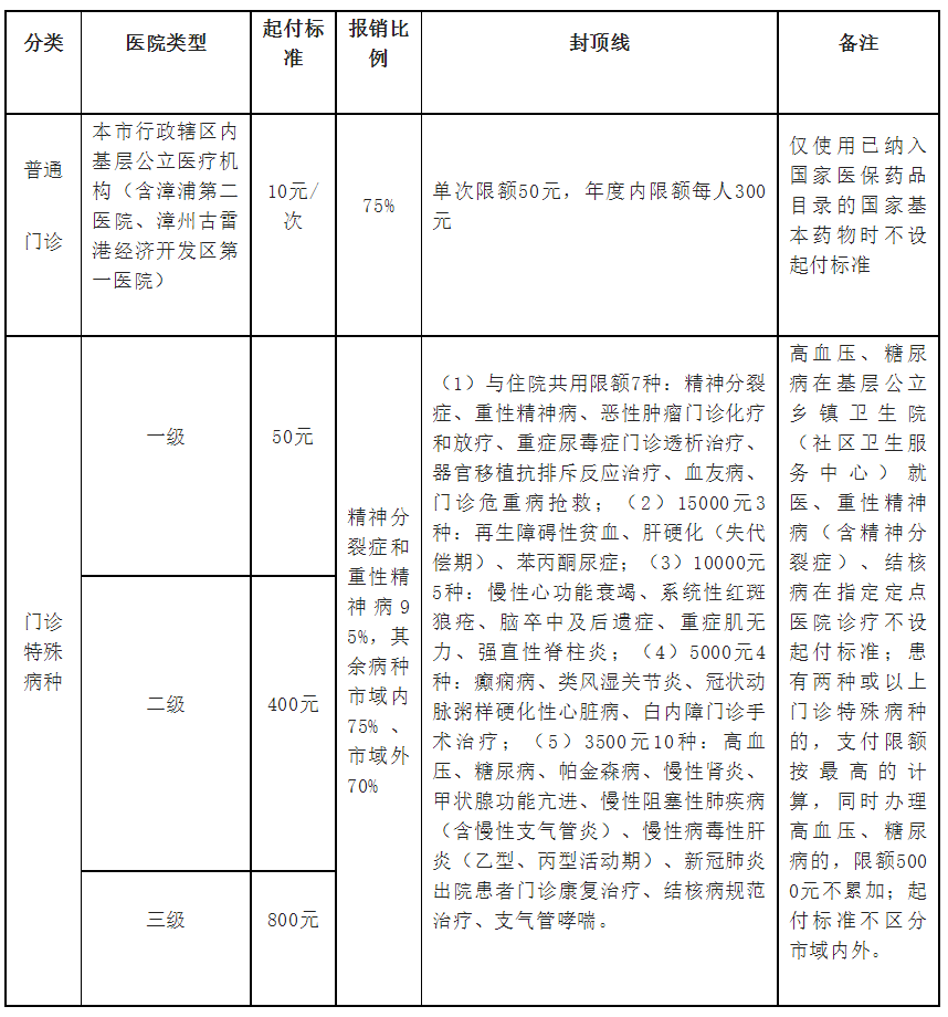 《漳州市城乡居民基本医疗保障市级统筹实施办法》(漳政办〔2017〕201号)于2022年到期。根据上级出台最新政策文件和省、市部署要求,借鉴其他地区做法并结合我市实际,对原有政策进行了全面梳理修订,制定《漳州市城乡居民基本医疗保险实施办法》(以下简称《实施办法》)。 政策执行起止时间 《实施办法》自2023年1月1日起施行,有效期五年。 附表:城乡居民医保待遇(普通门诊和门诊特殊病种)