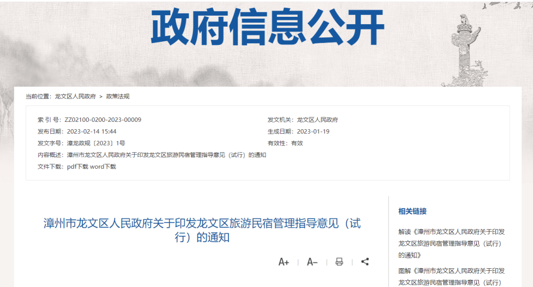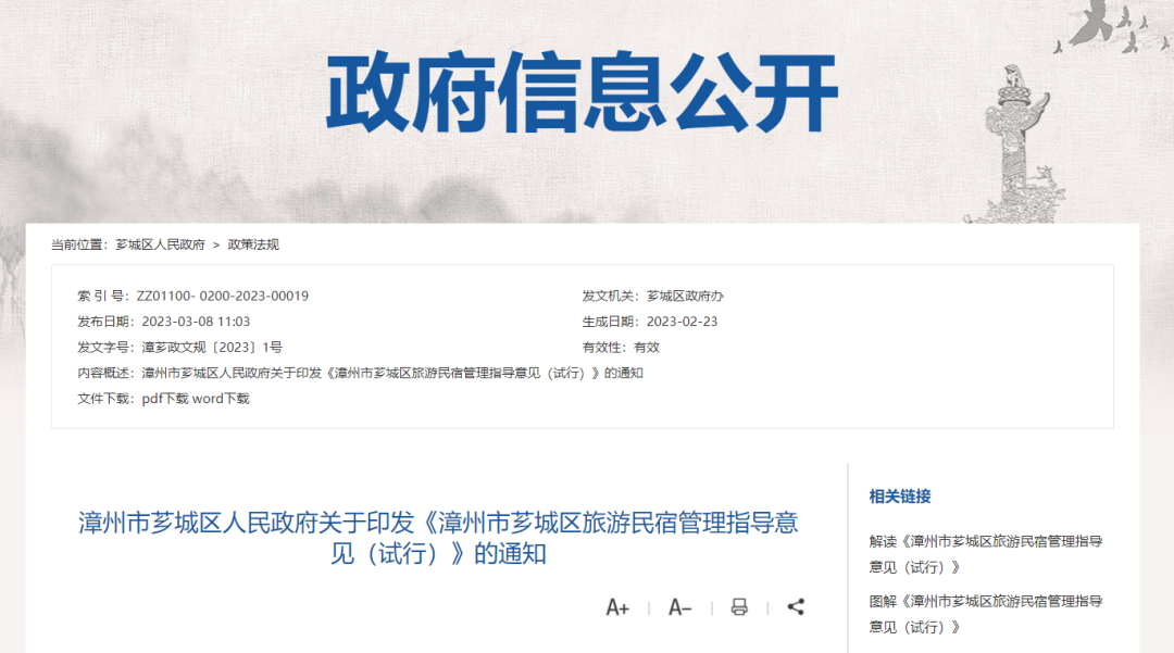 漳州市芗城区人民政府关于印发《漳州市芗城区旅游民宿管理指导意见(试行)》的通知