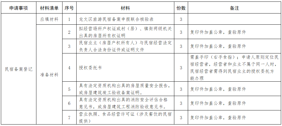 (一)旅游民宿经营者按规定填写《龙文区旅游民宿备案表》及提供相关申报材料;