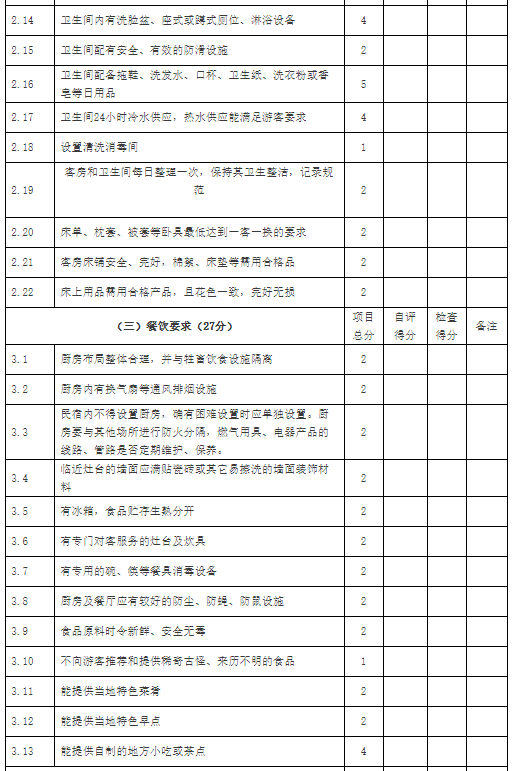 为引导我区旅游民宿发展,规范经营行为,提高服务水平,推进标准化建设,根据《旅游民宿基本要求与等级划分(中华人民共和国国家标准GB/T 41648-2022)》《福建省乡村旅游经营单位服务质量等级划分与评定(福建省地方标准DB35/T1051-2016)》,结合我区实际,制定本要求。2.接待区域根据经营需要,进行必要的绿化、硬化、美化处理;附近无污染源。4.若使用集中式空调,其卫生标准必须符合通风系统卫生规范。1.双人房每间不低于8平方米,客房布局合理,门锁为暗锁,有防盗装置,在显著位置张贴应急疏散图及相关说明,备有服务指南价目表、住宿须知和公用电话,有防蚊蝇、蟑螂等设施。2.配备桌椅、床头柜、衣架、空调、电视机等基本接待设施和拖鞋、烟灰缸、茶水等生活用品,家居用品使用性能较好。 3.设有专用的清洗消毒间或者委托有资质的清洗消毒公司;设有专用布草间(储藏间);枕套床单等床上用品整洁,做到一客一换,及时清洗消毒。被褥枕芯等床上用品保持整洁干燥,无异味,定期消毒。4.客房每日至少打扫一次,整洁卫生,提供早叫服务。5.单家民宿经营规模:客房不超过14间,不超过4层,建筑面积不少于200㎡,不超过800㎡。1.每个楼层至少有一间供住宿客人洗漱、沐浴、如厕的盥洗室,通风、照明条件完善,冲洗设备完好,卫生清洁,干湿分离,不具备干湿分离条件的须有防滑标志,配备梳妆镜。24小时供应冷热水。2.必须统一使用电热水器或太阳能热水器等,安装和使用符合通风、散热等消防安全条件。1.厨房最小面积不小于8平方米。厨房布局、作业流程合理,通风良好,紧邻餐厅。食品和非食品存放场所应分区、生熟食品分案加工且分器分区存放。2.厨房整洁卫生,有防蚊蝇、蟑螂、老鼠等设施;地面经硬化防滑处理,墙面瓷砖墙裙1.5米以上。3.至少设置3个清洗水池,食品原料和餐具分开清洗;有冷藏、冷冻、消毒设施;厨房油烟废气排放合理规范。4.食品来源和食品加工符合食品卫生要求,有台账记录,食品来源可以追溯,食品质量承诺制度齐全有效,饮用水达到安全标准。5.餐厅布局合理,采光通风好,整洁卫生;餐厅、酒具等各种器具配套应密闭存放、无破损,有消毒设施且定期消毒。1.经营用房无危房,无乱搭乱建设施;门窗及锁具、桌椅、床等家具安全可靠。2.过道、安全出口、楼梯配备应急照明灯,4公斤干粉灭火器每层设置不少于1个。建筑面积大于200平方米室内设置消防软管卷盘,卷盘布置应保证水流能到达室内任何一点,卷盘可与生活用水系统连接。3.应在明显位置设置消防安全“三提示”等内容,客房内宜设置旅客须知、疏散指示图等消防安全标志标识。安全出口、疏散走道及其转角处设置灯光疏散指示标志,楼梯间、疏散走道和公共活动场所设置消防应急照明灯具。4.厨房的燃料应设置在符合标准的构筑物内,并应设相应的应急处置措施;厨房与其它部位应采取符合规范要求的防火措施进行分隔。5.民宿建筑及相关设施还应符合公安、消防等部门制订的相关技术标准。6.有民宿消防安全管理制度、环境卫生制度、安全巡视制度、入住登记制度、食品卫生制度、质量承诺制度,并上墙。7.室内不采用易燃、可燃材料装修、装饰。电气线路、设备不应铺设、安装在可燃物上;必须铺设、安装在可燃物上时,应采取套阻燃管等防护措施。8.民宿应在每个房间和室内走道等公共部位设置独立式烟感报警器、建筑超过三层且仅有一部疏散楼梯的民宿住宿房间内每个床位应设配置一具自救呼吸器。9.应保持走道、楼梯、窗户、安全出口畅通,不能设置影响逃生的金属栅栏或放置其他遮挡物。11.制定灭火和疏散预案,每半年至少组织一次消防演练。2.从业人员掌握旅游接待服务基本知识,文明有礼,服务热情,能用普通话进行接待服务。3.主要从业人员掌握基本安全知识和使用安全设备的基本技能,并具有在紧急情况下电话报警基本知识。2.经营场地有专人打扫,基本无污水污物,无乱扔乱放。3.生活垃圾集中收集,统一处理;生活污水经处理达标排放,有条件的纳入村污水处理系统统一处理,经处理后废水有合理排放去向。4.依法经营,明码标价,诚实守信,礼貌待客。设有旅游服务质量意见本,能按游客意见改进服务。1.民宿经营者应于每年1月及7月底前,将前半年每月客房入住率、住宿人数、经营收入统计等资料,依式呈报主管部门。2.民宿经营者应参加主管部门举办或者委托有关部门、团体举办的辅导培训。3.民宿经营者对于主管部门定期或者不定期检查时应积极配合,并提供必要帮助。漳州市龙文区人民政府关于印发龙文区旅游民宿管理指导意见(试行)的通知郭坑镇政府、各街道办事处、开发区管委会,区直各单位: