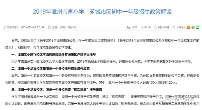日前,我局出台了《关于2019年漳州市直公办小学一年级招生工作的意见》《关于2019年漳州芗城市区公办学校初中一年级招生工作的意见》,相较往年,今年度招生政策有如下变化: 一、漳州实小腾飞校区不面向施教区外芗城市区户籍学生摇号 因近年来漳州实小腾飞校区入学人数逐年剧增,2019年无剩余学位提供摇号,经市招委会同意,今年不面向施教区外生源摇号招生。 二、漳州一中龙文校区和漳州一中分校摇号招生条件放宽 此前,漳州一中龙文校区和漳州一中分校摇号招生条件为:需同时具备芗城市区户籍与学籍。为体现义务教育招生的公平公正,经市招委会同意,报名条件调整为学生仅需具备芗城市区户籍即可参与摇号。其中,漳州一中分校摇号招生人数由100人增加至120人。 三、漳州一中龙文校区、漳州一中分校采取“梯次志愿”摇号录取 学生可同时填报漳州一中龙文校区、漳州一中分校摇号招生志愿,通过“梯次志愿”,即按志愿顺序摇号录取。若第一志愿报名人数超过招生计划数,该志愿采用电脑摇号方式录取;若第一志愿报名人数少于招生计划数,则全部录取;剩余招生数再从填报第二志愿的学生中采用电脑摇号派位方式录取。 四、芗城市区两个新拆分的居委会归属施教区范围 原湖内居委会拆分为湖内居委会和高校居委会,原华元居委会拆分为华元居委会和北郡居委会,根据原施教区划分范围,高校居委会归属漳州二中施教区,北郡居委会归属漳州八中施教区。其它施教区划分办法不变。 五、随迁子女采取“多校划片”方式,依照“遵循志愿、积分优先”原则录取 根据《漳州芗城市区随迁子女小升初积分入学办法(试行)》,芗城市区公办小学毕业,且父(母)持有芗城市区居住证满6个月(2019年申请小升初的,仅需持有该证即具备申请条件)的随迁子女,采用“多校划片”方式,依照“遵循志愿、积分优先”原则,根据志愿顺序按积分从高到低依次录取。市区初中校招生结束后,未被录取的随迁子女由市教育局协调至芗城区、龙文区教育局解决入学,或引导其回户籍地入学。 六、重要提醒 市区公办初中一年级报名时间为5月13日-15日,报名相关材料或证明必须于2019年5月13日前取得。《报名须知》公布在市教育局网站。 市直公办小学一年级报名时间为6月29日-30日,报名相关材料或证明必须于2019年6月30日前取得。 免责声明:凡注明“来源:漳州楼市网”或“漳州楼市情报”的所有文字图片视频等资料,版权均归漳州楼市网/漳州楼市情报所有,转载请注明出处;文章内容仅供参考,不构成投资建议,也不代表漳州楼市网/漳州楼市情报赞同其观点。文中所涉面积如无特别说明,均为建筑面积。文章如有涉及侵权的内容、图片以及其它问题的,请联系本站删除,联系电话:0596-2182801。 |
