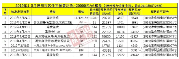 2019年1-5月漳州市区住宅预售均价>20000元/㎡楼盘(“漳州楼市情报”制图,截止2019年5月26日,请点开图片可放大看清晰大图) 据漳州楼市情报统计,2019年以来,共有新国贸天成、新元御景名墅、建发玺院、禹洲雍江府、禹洲雍禧澜湾、中海上湾等6个楼盘11个楼栋取得20000元/㎡以上的预售证。其中,国贸天成、新元御景名墅、中海上湾为类别墅(叠墅/联排)住宅产品,建发玺院、禹洲雍江府、禹洲雍禧澜湾为高层住宅产品。