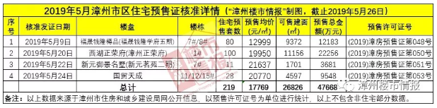 2019年5月漳州市区住宅预售证核准详情(“漳州楼市情报”制图,截止2019年5月26日,请点开图片可放大看清晰大图) 据漳州楼市情报统计,截止5月26日,5月漳州市市区仅有4个住宅楼盘取得预售证,即福晟钱隆樽品、西湖正荣府、新元御景名墅、国贸天成,共计219套住宅房源取得预售,预售均价约17769元/㎡,预售总建筑面积约26826㎡。