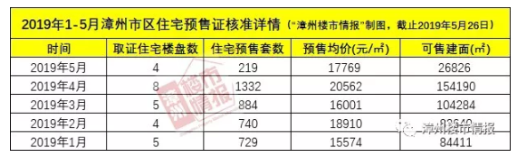 2019年1-5月漳州市区住宅预售证核准详情(“漳州楼市情报”制图,截止2019年5月26日,请点开图片可放大看清晰大图) 与4月相比,截止目前为止,5月预售住宅房源量,无论是套数,还是面积,都呈现断崖式下滑,住宅预售套数环比减少-84%、预售均价下降-14%、可售总建筑面积环比减少-83%,当然,5月还有5天,不排除月末存在翘尾的可能。据漳州楼市情报统计,截止2019年5月26日,1-5月漳州市区住宅获得预售的房源数量3904套、预售均价18112元/㎡、住宅房源预售面积总计约45万㎡。 来源:漳州市住房和城乡建设局 免责声明:凡注明“来源:漳州楼市网”或“漳州楼市情报”的所有文字图片视频等资料,版权均归漳州楼市网/漳州楼市情报所有,转载请注明出处;文章内容仅供参考,不构成投资建议,也不代表漳州楼市网/漳州楼市情报赞同其观点。文中所涉面积如无特别说明,均为建筑面积。文章如有涉及侵权的内容、图片以及其它问题的,请联系本站删除,联系电话:0596-2182801。 |