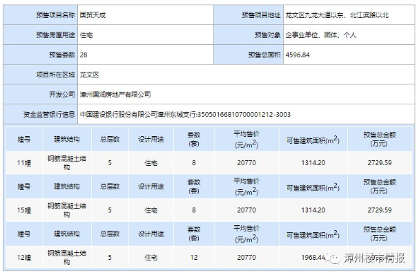 据漳州市住房和城乡建设局公开信息显示,国贸天成11、12、15#楼于2019年5月24日取得预售许可。本次预售住宅房源套数28套,预售总建筑面积约4597㎡,预售均价20770元/㎡,又一楼盘相关楼栋预售价20000+元/㎡,本月已有2个住宅楼盘获得单价超20000元/㎡的预售证。