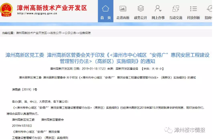 漳州高新区党工委 漳州高新区管委会关于印发《<漳州市中心城区“安得广”惠民安居工程建设管理暂行办法>(高新区)实施细则》的通知(漳高委〔2019〕1号) 各办(部、局、中心),大房农场,各下属公司: 《<漳州市中心城区“安得广”惠民安居工程建设管理暂行办法>(高新区)实施细则》已经漳州高新区2018年第15次党政联席会研究同意,现印发给你们,请结合实际认真遵照执行。 漳州高新区党工委 漳州高新区管委会 2019年1月18日 《漳州市中心城区“安得广”惠民安居工程建设管理暂行办法》(高新区)实施细则 第一章 总则 第一条 为进一步加强我区“安得广”惠民安居工程规划、建设、申请、审核、销售和管理等工作的贯彻落实,根据市政府办《关于印发漳州市中心城区“安得广”惠民安居工程建设管理暂行办法的通知》(漳政办〔2017〕312号,以下简称《暂行办法》)精神,结合我区实际,制定本实施细则。 第二条 本实施细则适用于高新区“安得广”惠民安居工程规划、建设、申请、审核、销售和管理等工作。 第二章 组织领导 第三条 为确保高新区“安得广”惠民安居工程项目规划、建设、申请、审核、销售和管理等工作顺利开展,成立高新区“安得广”惠民安居工程建设管理领导小组(以下简称:区“安得广”领导小组): 组 长:陈仁朝 区管委会调研员 副组长:谢伟宏 区建设管理局局长 林志旭 区党群工作部部长 成 员:廖毅敏 区经济发展局局长 黄茂三 区科技局负责人 张再发 区国土分局局长 李秋龙 区征迁服务中心主任 蔡良鹏 区靖城园区管理中心负责人 张锦征 颜厝镇党委副书记 徐志明 九湖镇党委统战委员 黄 毅 靖城镇副镇长 蒋慧生 西桥街道人大工委主任 蔡苏赟 漳州市房产交易中心漳州高新分中心 负责人 叶伟珊 区不动产登记处 许福寿 大房农场党委书记 区“安得广”领导小组下设办公室,挂靠在区建设管理局,办公室主任谢伟宏(兼),办公室副主任林志旭、廖毅敏、黄茂三、张再发、李秋龙、蔡良鹏(兼),颜厝镇政府、九湖镇政府、靖城镇政府、西桥街道办事处、漳州市房产交易中心高新区分中心、不动产登记处、大房农场各一名分管领导任成员。区“安得广”领导小组负责组织协调高新区“安得广”惠民安居工程相关工作,各成员单位职责分工如下: (一)区建设管理局:负责对接市住建局做好区“安得广”惠民安居工程项目建设的日常管理工作;负责汇总申请对象名单、牵头组织符合条件的申请对象开展抽取选购房顺序号并发放选购房通知书及其他相关工作。 (二)区党群工作部:负责对接市委人才办,提供市委人才办统筹提出的在高新区各类高层次人才及军地融合官兵用房保障需求;负责核实区人才工作领导小组审批同意的的高层次人才;负责协调市人社局做好申请对象的社会保险(含养老保险,下同)缴纳情况证明、出具职称认定和国家职业资格等级认定工作;负责申请对象的学历确认工作;负责协调市、区相关部门做好在高新区就业创业的港澳台侨胞申请人员的核实确认工作。 (三)区国土分局(不动产登记处):负责对接市国土局(不动产登记处),协助相关部门查询申请对象及其共同申请的家庭成员在芗城区、龙文区及龙海市的九湖镇、颜厝镇和南靖县的靖城镇的不动产登记信息、办理不动产登记等工作。 (四)区经济发展局:负责确认上一年度在高新区纳税200万元以上(含200万元)重点企业(工业企业必须符合国家产业政策和高新区产业规划)并提供重点企业清单。 (五)区科技局:负责提供国家、省、市、区认定的科技型企业及其他科技类企业清单,对接市科技局做好科技型企业的确认工作。 (六)区征迁服务中心:负责对圆山新城范围内经属地镇政府、街道办事处初审的“安得广”惠民安居工程申请对象的拆迁安置情况进行复核。 (七)区靖城园区管理中心:负责对靖城园区范围内经属地镇政府初审的“安得广”惠民安居工程申请对象的拆迁安置情况进行复核。 (八)各镇政府、街道办事处:负责“安得广”惠民安居工程项目申请对象提交申请材料的汇总和初审,负责申请对象辖区范围内的自建房及安置情况证明。 (九)大房农场:负责提供大房农场区域内申请对象的自建房及拆迁安置情况证明。 第三章 申请程序 第四条 高新区“安得广”惠民安居工程项目由开发企业负责销售管理,区“安得广”领导小组负责督促指导开发企业进行销售,各成员单位做好相关工作。具体程序为: (一)区建设管理局根据高新区“安得广”项目建设进展情况,通过高新区区政府网站和各有关媒体发布销售申请公告并受理申请,每批次受理申请时限为1个自然月,直至所有房源销售完毕或项目交付使用6个月后,受理申请工作结束。同时在高新区区政府网上提供《高新区“安得广”惠民安居工程申请表》与一次性申请告知材料。符合《暂行办法》和本实施细则的申请对象既可在高新区政府网上下载《高新区“安得广”惠民安居工程申请表》,也可到所在地的镇政府、街道办事处领取);区经济发展局、科技局同时公布负责确认上一年度在高新区纳税200万元以上(含200万元)重点企业(工业企业必须符合国家产业政策和高新区产业规划)和国家、省、市、区认定的科技型企业及其他科技类企业。 (二)申请对象属在漳就业创业人员家庭或个人的,应向所在单位提出申