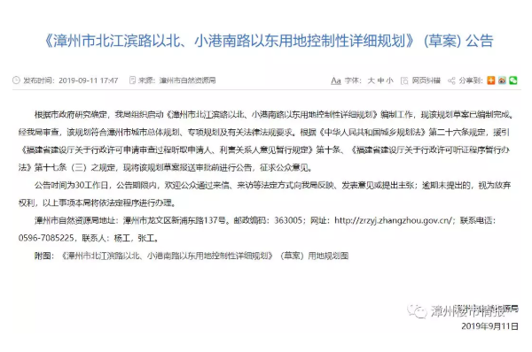 《漳州市北江滨路以北、小港南路以东用地控制性详细规划》 (草案) 公告 根据市政府研究确定,我局组织启动《漳州市北江滨路以北、小港南路以东用地控制性详细规划》编制工作,现该规划草案已编制完成。经我局审查,该规划符合漳州市城市总体规划、专项规划及有关法律法规要求。根据《中华人民共和国城乡规划法》第二十六条规定,援引《福建省建设厅关于行政许可申请审查过程听取申请人、利害关系人意见暂行规定》第十条、《福建省建设厅关于行政许可听证程序暂行办法》第十七条(三)之规定,现将该规划草案报送审批前进行公告,征求公众意见。 漳州市自然资源局 2019年9月11日 附图:《漳州市北江滨路以北、小港南路以东用地控制性详细规划》(草案)用地规划图