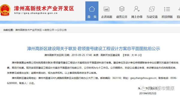 发表时间:2020-11-25 12:04来源:漳州楼市情报 【编者注:为了向网友提供更多更丰富的资讯,本网将转载、转发部分回顾性资讯,相关资讯的发布时间、所述事件时间,请网友留意。注:本文发布于2019年9月。】 2019年9月25日,漳州高新区建设局发布《漳州高新区建设局关于联发君领壹号建设工程设计方案总平面图批前公示》,据该公示显示: