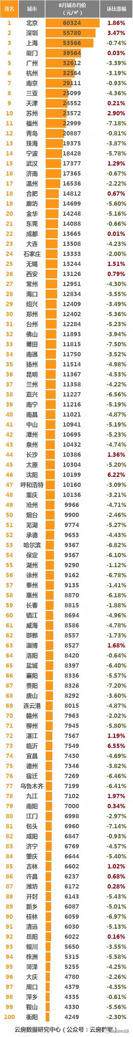厦门(排名第4)均价39564元/㎡,环比涨0.03%;