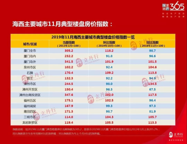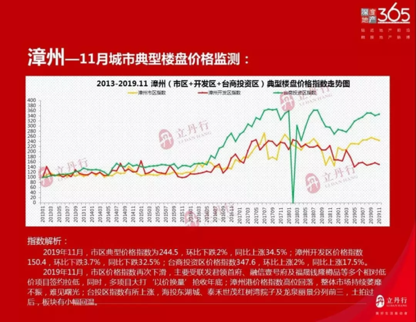 发表时间:2020-12-02 18:19来源:漳州立丹行地产研究中心 【编者注:为了向网友提供更多更丰富的资讯,本网将转载、转发部分回顾性资讯,相关资讯的发布时间、所述事件时间,请网友留意。注:本文发布于2019年12月。】 据立丹行研究中心12月20日发布《2019年11月海西主要城市典型楼盘价格指数》显示,2019年11月,漳州市区房价典型价格指数为244.5,环比下跌2%,同比上涨34.5%;漳州开发区价格指数150.4,环比下跌3.7%,同比下跌32.5%;漳州台商投资区价格指数347.6,环比上涨2%,同比上涨17.5%! 漳州市区2019年11月房价指数再次下滑,主要受联发君领首府、融信壹号府及福晟钱隆樽品等多个相对低价项目签约拉低,同时,多项目大打“以价换量”抢收年底; 漳州开发区(漳州港)11月房价指数高位回落,整体市场持续萎靡不振,难见曙光; 漳州台投区(角美)11月房价指数有所上涨,海投东湖城、泰禾世茂红树湾院子及龙泉丽景分列前三,土拍过后,板块小幅回温。