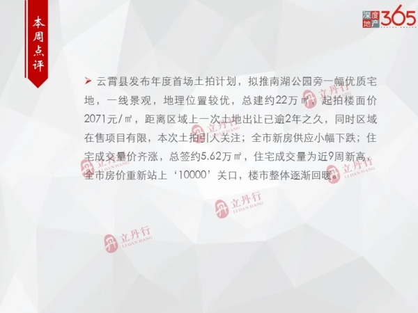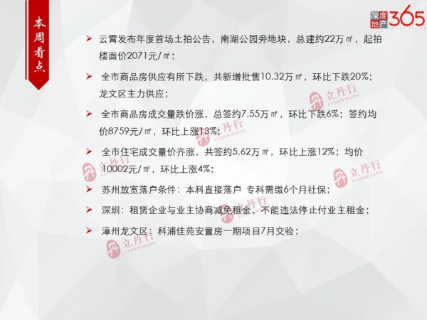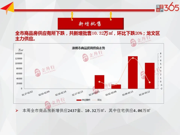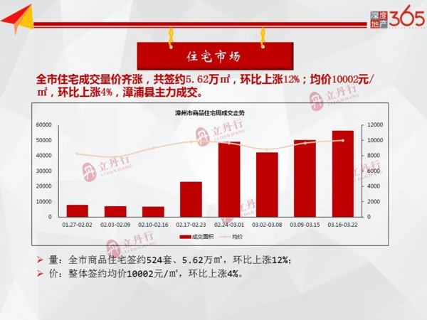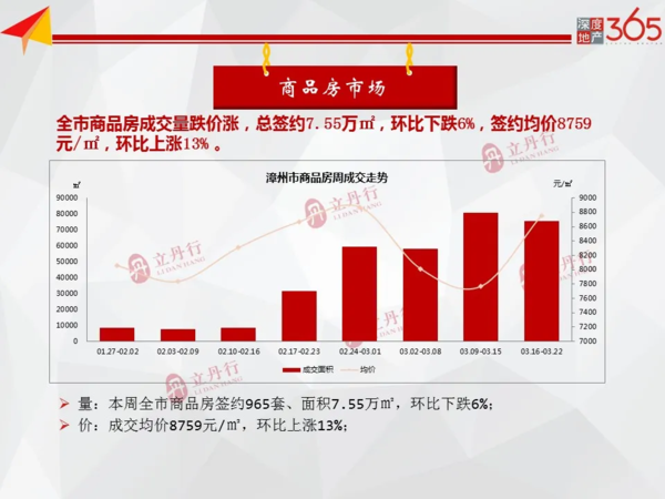 发表时间:2020-12-08 16:23来源:漳州立丹行地产研究中心 【编者注:为了向网友提供更多更丰富的资讯,本网将转载、转发部分回顾性资讯,相关资讯的发布时间、所述事件时间,请网友留意。注:本文发布于2020年3月。】 本周综述: 1、漳州全市商品房成交量跌价涨,总签约7.55万㎡,环比下跌6%,签约均价8759元/㎡,环比上涨13%; 2、漳州全市住宅成交量价齐涨,共签约5.62万㎡,环比上涨12%;均价10002元/㎡,环比上涨4%。