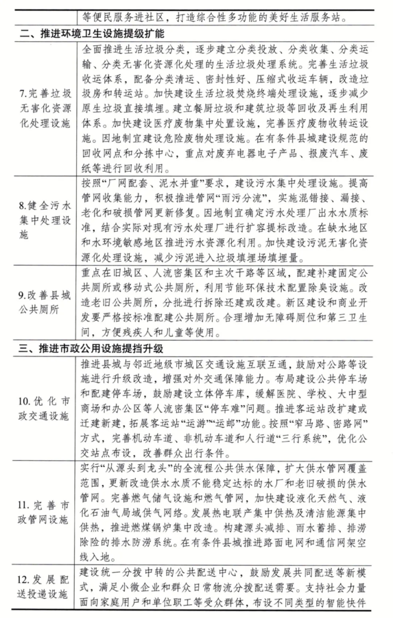 漳州所有县城注意! 国家近期发布! 事关你的家乡! 在推进环境卫生设施提级扩能方面,有3项建设任务。包括建设生活垃圾焚烧终端处理设施、提标改造污水处理厂、改造老旧公共厕所等任务。 在推进市政公用设施提档升级方面,包含5大项建设任务。主要是建设公共停车场、更新改造水厂和老旧破损供水管网、建设新型基础设施、完善水电气路信等配套基础设施和养老托育、停车、便民市场等公共服务设施等任务。 在推进产业培育设施提质增效方面,有3大项建设任务。包括了在产业园区和特色小镇等县城产业集聚区内,健全检验检测认证中心、技术研发转化中心,以及在零售型农贸市场和社区菜市场完善环保设施、改造畜禽定点屠宰加工厂等。 具体可点击查看:国家发展改革委有关负责人就《关于加快开展县城城镇化补短板强弱项工作的通知》答记者问县城城镇化 会从哪些方面入手? 具体看看