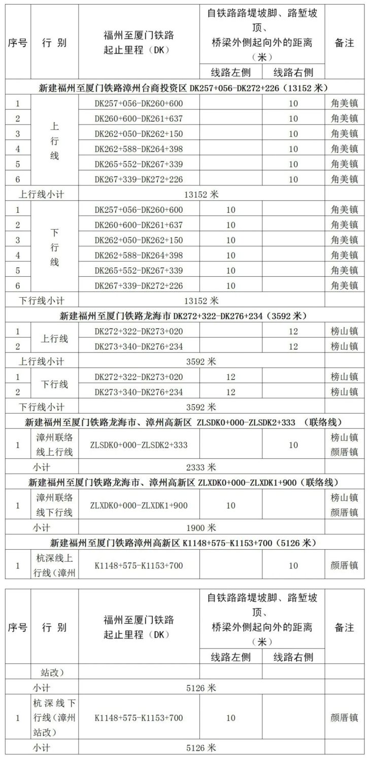 发表时间:2020-12-18 15:21来源:漳州政府网 【编者注:为了向网友提供更多更丰富的资讯,本网将转载、转发部分回顾性资讯,相关资讯的发布时间、所述事件时间,请网友留意。注:本文发布于2020年7月。】 近日,漳州市政府发布了 漳州市人民政府关于 新建福州至厦门铁路(漳州段)线路 安全保护区划定的通告 涉及哪些地方? 一起来看看! 漳州市人民政府关于 新建福州至厦门铁路(漳州段)线路 安全保护区划定的通告 漳政综〔2020〕32号 根据《铁路安全管理条例》(国务院令第639号)第二十七条规定,划定我市辖区内新建福州至厦门铁路(漳州段)线路安全保护区。现通告如下: 一、新建福州至厦门铁路(漳州段)线路安全保护区划定(详见下表): 新建福州至厦门铁路(漳州段)线路 安全保护区划定情况表