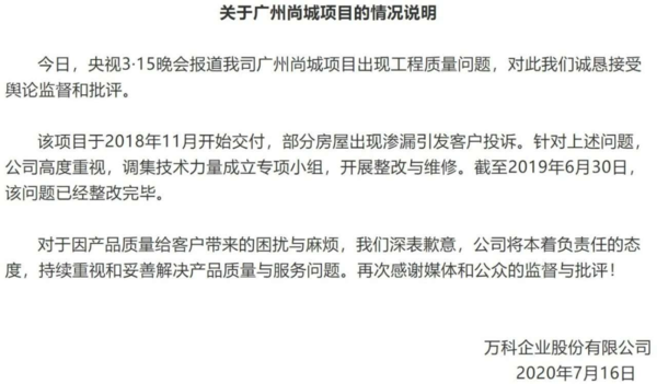 晚会播出后,万科连夜给出回应。表示存在工程质量问题,接受舆论监督和批评,对客户表示歉意。