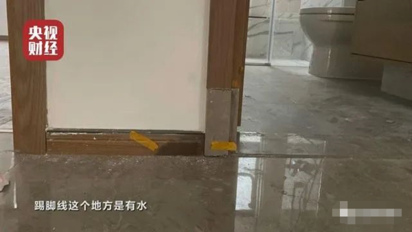 这是2018年11月该小区业主验房时看到的情景,楼上做蓄水试验时,楼下卫生间漏水的惨状,让业主们乔迁新居的喜悦顿时跌入谷底。