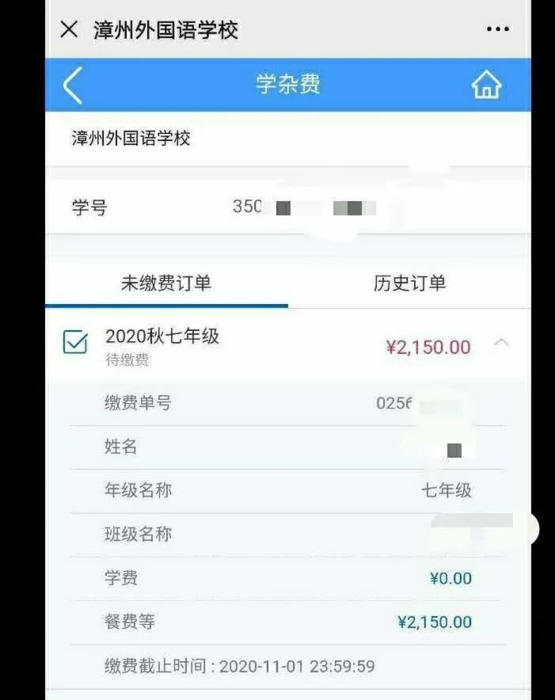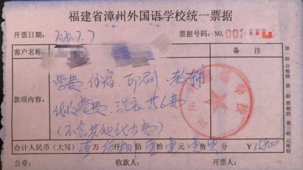 发表时间:2021-01-04 18:03来源:海峡导报大漳州 【编者注:为了向网友提供更多更丰富的资讯,本网将转载、转发部分回顾性资讯,相关资讯的发布时间、所述事件时间,请网友留意。注:本文发布于2020年9月。】 近日,不少家长拨打导报漳州新闻热线0596-2056315,投诉漳州外国语学校(漳州实验中学分校)乱收费,开学前刚交完一笔费用,开学后又要求缴费,疑似存在重复收费,且每个人收费金额不同,老师给的解释也含糊不清。 01 家长投诉 收费项目不详,疑有重复收费 家长黄女士给导报记者出示了一张“福建省漳州外国语学校统一票据”,开票时间是今年7月7日,款项内容包括学费、住宿、印刷、教辅、代收餐费、洗衣等6项(不含其他代办费),收据总额是15800元。“这是7月份缴费时学校给的收据。”黄女士说,她孩子今年读7年级,小学也在外国语学校就读,以往学校都是开学前缴交一笔学费,之后就没再额外收取。今年开学后,老师又通知要再缴交一笔2150元的费用,有老师说是餐费,但是餐费在第一笔费用收据里面就有了。