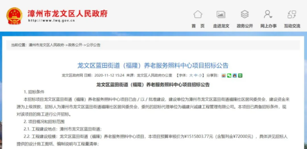 发表时间:2021-01-08 16:30来源:龙文区融媒体中心 【编者注:为了向网友提供更多更丰富的资讯,本网将转载、转发部分回顾性资讯,相关资讯的发布时间、所述事件时间,请网友留意。注:本文发布于2020年11月。】 近日,小V从龙文区政府网了解到 蓝田街道福隆社区 将新建一养老服务照料中心 目前正处于项目招标阶段