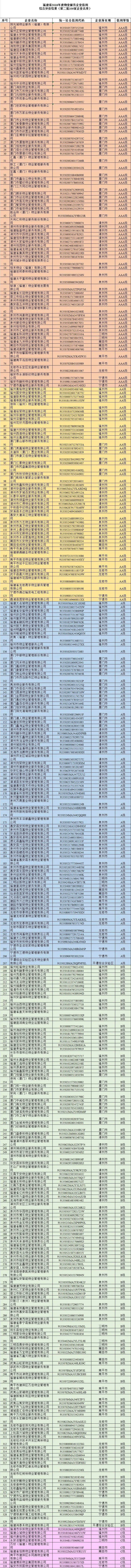 福州市住房保障和房产管理局,厦门市建设局,漳州、三明、莆田、南平、龙岩市城市管理局,泉州、宁德市住房和城乡建设局,平潭综合实验区交通与建设局,各物业服务企业: 根据《关于推进物业服务企业信用综合评价的实施意见》和《关于开展2018年度物业服务企业信用综合评价的通知》(闽建办房函〔2019〕18号)的有关要求,经各县(市、区)及开发区物业管理主管部门对辖区内物业服务企业信用信息进行采集、确认、记分,各设区市物业管理主管部门复审,并经省厅公示,现将福建省2018年度物业服务企业信用综合评价结果(第二批339家企业名单)予以公布。 附件:福建省2018年度物业服务企业信用综合评价结果(第二批339家企业名单) 福建省住房和城乡建设厅办公室 2020年11月13日 78家物业获评AAA级! 你家物业在哪个等级?