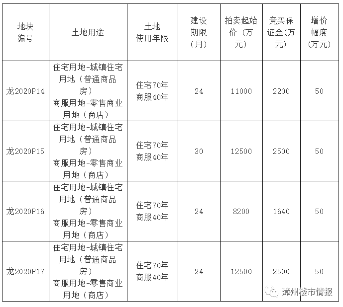 二、出让条件: (一)本批次拍卖地块以“净地”出让,出让人将按地块现状交付土地,出让人不再对场地进行处理,若竞得人认为需对场地进行土石方平整的,由其自行处理并承担相应费用。 (二)拍卖地块规划区域内的市政公共设施项目由竞得者按规划要求自费配套完善。如地下有构筑物或其他相关设施,由竞得人自行与有关部门协商解决,周边各种配套以现状为准。 (三)本次拍卖地块依法设定保留价。 (四)地下空间开发必须符合《福建省地下空间建设用地管理及土地登记暂行规定》,本次拍卖出让成交价包括规划条件要求应配备的地下停车位、人防、配电室等配套设施的地下空间使用权价款,但不包括商业、办公、娱乐、仓储等经营性用途的地下室使用权价格及城市基础设施配套费、契税、耕占税、印花税等基金税费,竞得者按规定向有关部门另行缴纳。 (五)根据《福建省国土资源厅 福建省住房和城乡建设厅转发国土资源部 住房和城乡建设部关于优化2015年住房及用地供应结构促进房地产市场平稳健康发展的通知》(闽国土资综〔2015〕157号)精神,为适应市场需求,本次土地出让取消住宅用地中小套型比例限制。 (六)龙2020P16宗地禁止建设别墅类住宅。 三、竞买人范围: 中华人民共和国境内外法人、自然人和其他组织均可申请参加,申请人可以单独申请,也可以联合申请,联合竞买者应提交联合竞买者各人所占比例份额协议书。 属企业原因未按《国有建设用地使用权出让合同》约定进行土地开发而造成土地闲置一年以上且整改未到位的企业及其控股股东、被列为失信行为人或在本市范围内欠缴土地出让金的单位和个人,在土地开发过程中违法占用土地、非法交易土地受到处罚的,以及法律、法规另有规定的,禁止其参与本次国有建设用地使用权竞买活动。 四、拍卖出让活动的时间 公告起始时间:2020年12月2日至2020年12月22日,有意竞买者可于2020年12月2日至2020年12月22日(每日8:30至11:30、15:00至17:30,法定节假日除外)到龙海市自然资源局综合楼3楼收储中心咨询、获取拍卖出让文件。 竞买保证金缴交截至时间:2020年12月22日16:30 提交书面申请截止时间:2020年12月22日17:30 我局将在2020年12月23日10:00前确认竞买资格,竞买人应凭有效身份证明文件于2020年12月23日14:30至15:30(北京时间)登记并领取《竞买资格确认书》和竞买标志牌,竞买人持竞买标志牌参加拍卖会。 拍卖开始时间:2020年12月23日15:30 拍卖地点:龙海市紫葳路9号荣昌公馆写字楼(龙海市行政服务中心东侧)11楼龙海市公共资源交易中心 五、其它事宜: (一)龙海市自然资源局为本次国有建设用地使用权拍卖出让的出让人,具体组织实施由龙海市土地收购储备中心承办。 (二)本次出让活动采用现场拍卖,拍卖过程由龙海市公证处进行现场监督公证并出具公证书。 (三)现场拍卖由漳州盛誉拍卖有限公司承办,拍卖主持人由漳州盛誉拍卖有限公司指定。拍卖佣金由竞得人在成交之日起10个工作日内支付给漳州盛誉拍卖有限公司,计价标准为:每宗基价8000元,成交价超出出让起始价部分另按0.22‰收取,每宗佣金最高不超过40000元。 (四)本次拍卖出让宗地的具体要求和各宗地竞买保证金缴交账户详见《拍卖出让须知》的文件资料。 (五)本公告与《拍卖出让须知》及相关出让文件资料均为不可分割的整体,对竞买人的竞买、签约和合同履行均具有约束力。 (六)本公告视同登记公告。凡对此宗地有异议者,请自公告之日起30日内,持有关证件及材料向我局提出,逾期没有提出异议的,将在公告期满、办理供应手续后,直接登记给受让方,该宗地范围内原有土地证同时作废。 (七)我局对于本次拍卖出让相关事宜具有解释权。