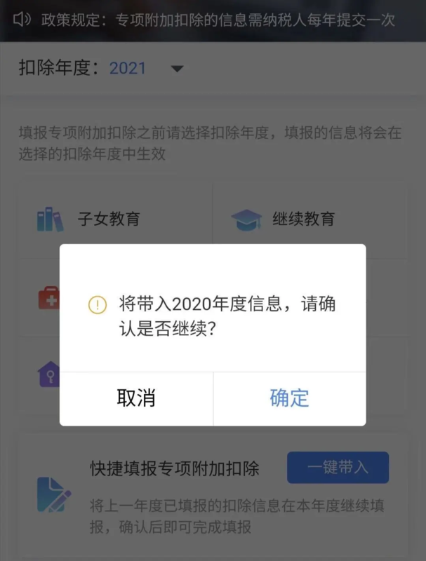 根据操作指引,填报专项附加扣除信息可以快捷操作: 选择扣除年度2021年,一键带入,如有变动,还可以点击修改,然后一键确认完成该项操作。 来源:国家税务总局网站、人民网、中国经济网等 来源:南昌楼市情报 免责声明:凡注明“来源:漳州楼市网”或“漳州楼市情报”的所有文字图片视频等资料,版权均归漳州楼市网/漳州楼市情报所有,转载请注明出处;文章内容仅供参考,不构成投资建议,也不代表漳州楼市网/漳州楼市情报赞同其观点。文中所涉面积如无特别说明,均为建筑面积。文章如有涉及侵权的内容、图片以及其它问题的,请联系本站删除,联系电话:0596-2182801。 |