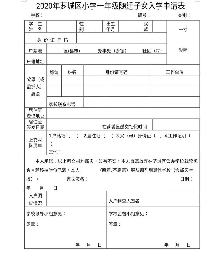 附件2:《2020年芗城区小学一年级随迁子女入学申请表》