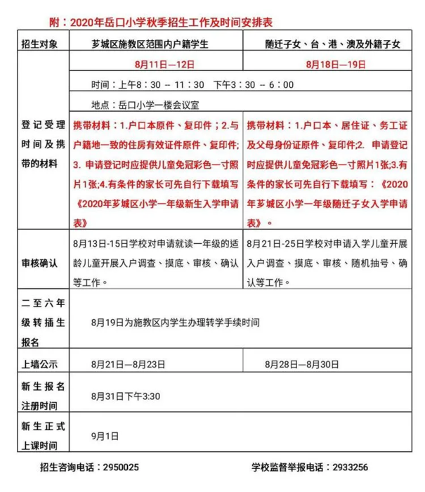 漳州市岳口小学2020年秋季招生公告为贯彻落实《中华人民共和国义务教育法》,进一步加强义务教育阶段招生管理,根据《漳州市芗城区教育局关于2020年芗城区公办小学一年级招生工作的意见》(漳芗教政〔2020〕162号)文件精神,进一步做好2020年秋季学校一年级招生工作,现结合我校实际,将我校一年级招生事项公告如下: 一、招生原则: 依据“免试就近入学”原则,按我校施教区范围招生。 二、招生计划: 9个班 三、施教区 岳口社区: 1.新华东路北侧单号691-801号,双号724-822号(单号803-931号,双号824-940号已拆迁) 2.菜市路(单号) 3.巷尾新村 4.诗馆顶 5.天成佳园 6.凤皋巷 7.建设巷 8.布店巷 9.丹霞名城、丹霞星城(西区ABC1-13幢) 民主里社区: 1.新华东南侧635-689号 2.菜市路(双号,含酱油厂宿舍) 3.福家园 4.御泰大厦 5.东湖大厦 6.建安大厦 7.汇福大厦 8.丹霞华庭 9.民主里新村 10.胜利东路科委宿舍 11.芗城区委党校漳响路住宅楼 12.胜利东新村(北) 13.菜市路新村 14.市设计院宿舍 15.芗城区妇幼保健院宿舍 16.通北卫生院宿舍 17.蔬菜公司宿舍(鸿达大厦) 18.市青少年宫宿舍 官园社区: 1.东南商贸城(东区1-7幢) 2.胜东广场 3.官园城堡 4.东新大厦 5.梦想家园 6.东兴公寓 7.东久大厦 8.瑞芳苑 9.和馥园 10.第一干休所 11.明欣福园 12.下井官园 13.建业路西侧(电力新村等) 14.漳州市工商局宿舍 15.水花园 东门社区: 1.锦绣大厦 2.美久花园 3.百江中央公馆 4.玫瑰园、天福园 5.上厝社 6.建业路东侧(含边检宿舍2座、市党校宿舍、芗城公安分局宿舍、市教育局八中宿舍等) 塔后社区: 1.夏商阳光雅苑 2.信隆花园(东方钻石城) 3.怡秀园 4.东塔大厦 5.塔后村 6.中天大厦东关社区:群勇村(1、2、3、4组) 福龙社区: 福海阳光 新增施教区: 1.官园社区的文华园 2.东门社区的清华园 3.东旭御峰(暂定) 四、招生对象: 招收符合政策条件、年满6周岁的适龄儿童,即2014年8月31日(含8月31日)前出生的适龄儿童。 五、招生办法: (一)芗城市区户籍施教区范围内适龄儿童遵循“人户一致”的原则招生,即适龄儿童的户口与实际居住地均在我校施教区内。 (1)适龄儿童的父母有施教区内住宅房产。家长须提供如下材料: ①适龄儿童父(母)在施教区内的不动产权证明材料; ②适龄儿童与父(母)同册的户口簿。 (2)适龄儿童的祖父母或外祖父母有施教区内住宅房产。家长须提供如下材料: ①适龄儿童的祖父母或外祖父母在施教区内的不动产权证明材料; ②祖孙三代同册的户口簿。 不动产权证明材料指商品住房规划用途为“住宅”的商品住房产权证,或提供以下其一: ①产权登记证明书; ②经房管部门备案的购房合同和购房发票; ③贷款抵押合同和购房发票; ④集体土地所有证。(备注:如果房产证原价在银行抵押,复印件需去银行加盖公章!) 上述第(1)(2)条款中,凡提供的户籍和不动产权证明材料与列出证件不符的,均须再提供房管部门出具的“适龄儿童和父母三方在芗城区、龙文区无其它房产”证明。 (3)适龄儿童的父(母)在芗城区、龙文区无房产而租住市管公房或父母单位未房改住宅楼,家长须提供以下合法有效的证件: ①市房管部门出具的市管公房租赁合同或单位证明; ②适龄儿童与父母同册的户口簿; ③房管部门出具的“适龄儿童和父母三方在芗城区、龙文区无其它房产”证明。(温馨提醒:房管部门出具的“适龄儿童和父母三方在芗城区、龙文区无其它房产”证明,落款日期应为2020年8月开具的证明方才有效。) 备注:今年本该入学的适龄儿童。若因身体原因无法按时入学,家长须向学校提交缓学申请并附医院证明等材料。法定监护人有义务送适龄儿童入学,确保适龄儿童按时入学接受义务教育,健康全面发展。不得无故不上学或到“私塾”“国学”“女德”等名义开展全日制教育的机构代替义务教育。(温馨提醒:本施教区户籍学生,请按时到学校申请报名登记,若因没按时到学校申请报名登记,学校招收学位已满,没有学位,将由教育局安排到其他有学位的学校就读。) (二)随迁子女在保证接收施教区内儿童入学的前提下,还有学位的方可接收居住在本施教区内随迁子女入学申请。 1.随迁子女入学申请须提供如下材料: ①外县区户口簿和父(母)身份证; ②其父(母)在芗城区务工的证明或经商办企业证照; ③其父(母)在2020年3月15日(含15日)之前签发的芗城区居住证。 2.符合我校施教区所属范围条件的随迁子女可到我校申请登记,不得跨校重复申请,不得提供虚假资料,否则将取消在我学校就读资格。 3.有购买施教区内房产或能提供父(母)近一年在芗城区社保缴费满一年证明的随迁子女,同等条件可优先录取。 4.原属于巷口中心小学施教区范围的一年级随迁子女,符合报名条件的,今年到我校申请登记。 符合上述条件的,根据就近原则,向学校提出入学申请。学校根据申请人提供材料进行审核,入户调查,在有空余学位的前提下,经公示后予以注册。当申请登记入学人数超过学校学位余额时,学校采取随机抽号办法公平解决入学。未被抽中的学生,调剂到有剩余学位的学校。若不服从安排者,视为自动放弃在我区公办学校就读机会。 (三)台、港、澳及外籍子女在我校施教区内拥有住宅房产且实际居住的台、港、澳及外籍子女,可持大陆居住证、往返证、通行证及房产材料原件及复印件到我校申请登记,如学位已满,由芗城区教育