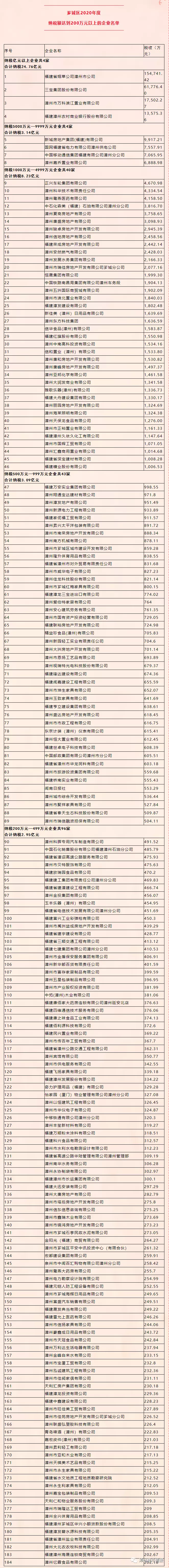 芗城区2020年度“经济建设突出贡献奖”企业名单 福建省烟草公司漳州市公司 三宝集团股份有限公司 漳州市万科滨江置业有限公司 福建漳州农村商业银行股份有限公司 新城房地产集团(福建)有限公司 国网福建省电力有限公司漳州供电公司 中国移动通信集团福建有限公司漳州分公司 漳州嘉乔置业有限公司 芗城区2020年度“经济建设贡献奖”企业名单 正兴车轮集团有限公司 漳州科华技术有限责任公司 漳州鹭燕医药有限公司 中石化森美(福建)石油有限公司漳州分公司 漳州夏商房地产有限公司 漳州唐盛房地产有限公司 漳州骏卓房地产开发有限公司 漳州信地房地产有限公司 福建荣成房地产开发有限公司 漳州安然燃气有限公司 漳州发展水务集团有限公司 漳州市瑞佳房地产开发有限公司芗城分公司 恒晟集团有限公司 中国铁路南昌局集团有限公司漳州车务段 漳州五洲国际商贸城有限公司 漳州市滨北置业有限公司 福建漳发建设有限公司 新佳美(漳州)日用品有限公司 漳州东方科技集团 信华食品(漳州)有限公司 福建红旗股份有限公司 漳州中南高科投资有限公司 信和置业(漳州)有限公司 漳州唐和房地产开发有限公司 漳州唐峰房地产开发有限公司 漳州亚邦化学有限公司 漳州大润发商业有限公司 雅歌乐器(漳州)有限公司 福建大舟建设集团有限公司 漳州丽园房地产开发有限公司 漳州海莱照明有限公司 漳州天保龙食品有限公司 漳州市正裕置业有限公司 福建漳州久依久化工有限公司 漳州市国辉工贸有限公司 漳州汇鑫商用置业有限公司 福建省深宝建材有限公司 福建糖业股份有限公司 芗城区2020年度“纳税大户”企业名单 福建万安实业集团有限公司 漳州翔通宝达建材有限公司 漳州漳发地产有限公司 漳州新源电力工程有限公司 福建家伲福工贸有限公司 漳州昇兴太平洋包装有限公司 漳州市南荣房地产开发有限公司 漳州南方机械有限公司 漳州市芗城区城市建设开发有限公司 漳州隆升体育用品有限公司 福建省漳州市对外贸易有限责任公司 漳州市威华电子有限公司 漳州佳龙科技股份有限公司 漳州市芗城红梅家具有限公司 福建漳龙三宝进出口有限公司 漳州爱伯特家居有限公司 漳州安心建筑劳务有限公司 漳州市国有资产投资经营有限公司 福建联裕房地产开发有限公司 精益珍食品(漳州)有限公司 漳州新园轻工实业有限责任公司 漳州大洲房地产开发有限公司 漳州市恩扬工艺品有限公司 漳州视瑞特光电科技股份有限公司 福建锋达建设有限公司 福建闽嘉建设工程有限公司 漳州市坤生家具有限公司 漳州玉致家具有限公司 福建亨立建设集团有限公司 漳州盛达房地产开发有限公司 漳州市市政工程有限公司 东京计装(漳州)仪表有限公司 漳州恒大置业有限公司 福建世卓电子科技有限公司 中国邮政集团有限公司漳州市分公司 福建省漳州市华龙饲料有限公司 漳州市旅游投资集团有限公司 福建桥南实业有限公司 闽南日报社 漳州城市综合开发有限公司 漳州市聚祥家具有限公司 福建省春天生态科技股份有限公司 漳州市瑞信融资担保有限公司 漳州科晖专用汽车制造有限公司 中国石化销售股份有限公司福建漳州石油分公司 福建省漳诏高速公路服务有限公司 漳州市贝特服饰有限公司 福建欧瑞园食品有限公司 福建建工集团有限责任公司漳州分公司 福建省建漳建设工程有限公司 漳州金投集团有限公司 玉丰乐器(漳州)有限公司 福建省电信技术发展有限公司漳州分公司 福建富兴工业彩弹枪有限公司 漳州市禹洲益成房地产开发有限公司 福建省建宇建设有限公司 福建省三顺交通工程有限公司 福建七建集团有限公司漳州分公司 漳州市金盾保安服务集团有限公司 漳州新华都百货有限责任公司 漳州市富存家居制品有限公司 漳州五星包装制品有限公司 漳州市产业股权投资有限公司 中拓(漳州)木业有限公司 福建康佰家大药房连锁有限公司漳州延安北店 福建四维通信技术服务有限公司 福建康之味食品工业有限公司 福建佰利源科技有限公司 福建民兴置业有限公司 漳州市传百年工贸有限公司 福建省漳州公路交通工程有限公司 漳州宾馆有限公司 漳州市供电服务有限公司 福建飞扬家具有限公司 福建漳州发展股份有限公司 奇力护理用品(福建)有限公司 怡家园(厦门)物业管理有限公司漳州分公司 漳州以恒建筑工程有限公司 漳州市华仪电子有限公司 中移铁通有限公司漳州分公司 漳州丰笙新材料有限公司 福建万顺粉末涂料有限公司 福建科兴食品有限公司 漳州市水利水电勘测设计有限公司 福建省高速公路华陆管理有限公司漳州管理部 漳州南华水务有限公司 漳州永协制袋有限公司 福建漳州市长运集团有限公司 福建大迅安装有限公司 漳州大唐房地产有限公司 漳州市塔后房地产开发有限公司 漳州信东信息咨询有限公司 漳州市鑫瑞木业有限公司 漳州市锦鸿房地产开发有限公司 漳州市芗城石亭民政水泥有限公司 金阳光(福建)商贸有限公司 漳州市芗城区平安中讯投资中心(有限合伙) 宏都建设集团有限公司 泉州市中闽百汇购物有限公司漳州分公司 漳州鹭燕大药房有限公司 漳州电力勘察设计院有限公司 福建元铠人防工程设备有限公司 漳州市芗城海辉日用品有限公司 漳州富盛汽车销售有限公司 福建晟发典当有限公