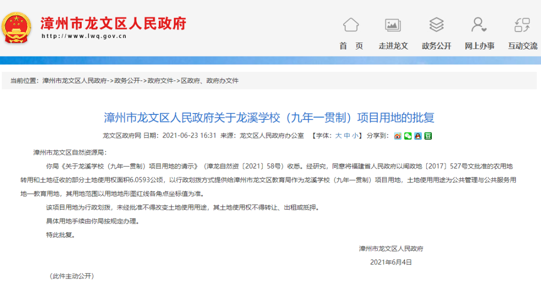 漳州市龙文区人民政府关于龙溪学校(九年一贯制)项目用地的批复 漳州市龙文区人民政府 2021年6月4日 (此件主动公开)