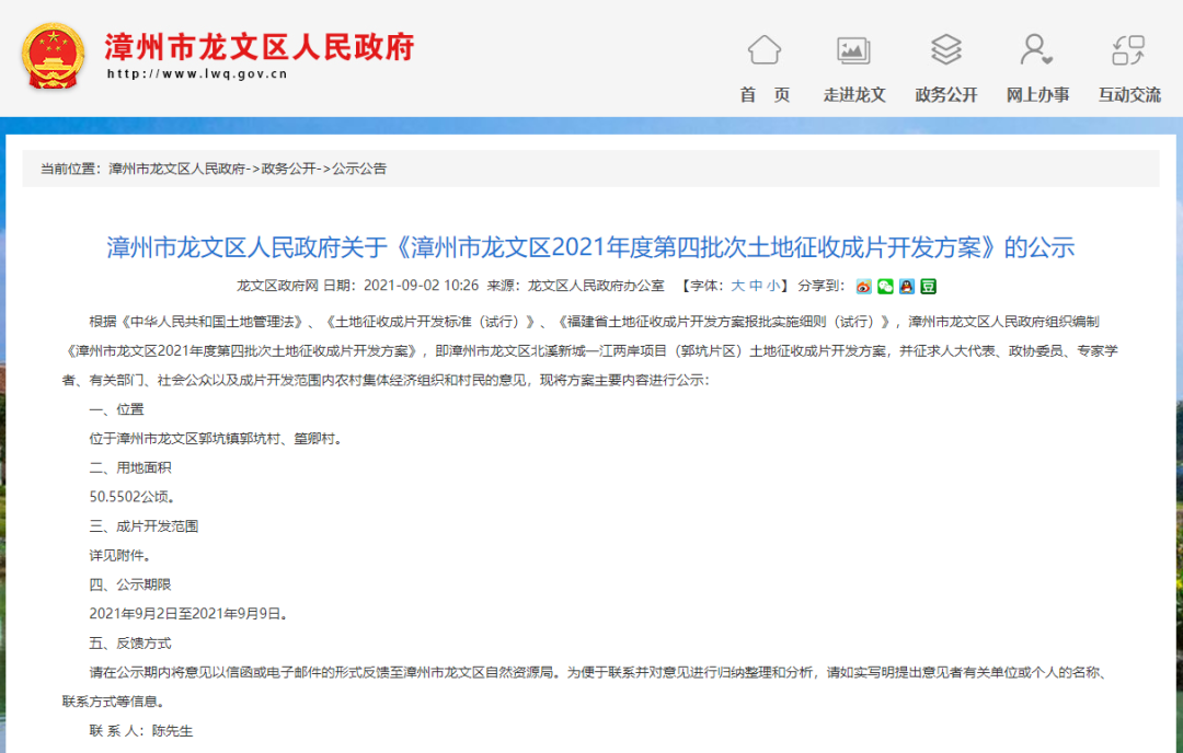 附:漳州市龙文区人民政府关于《漳州市龙文区2021年度第四批次土地征收成片开发方案》的公示 原文 漳州市龙文区人民政府 2021年9月2日