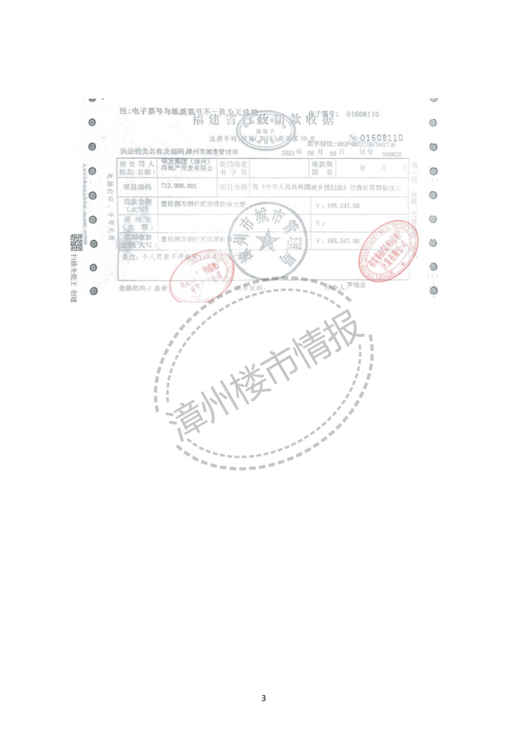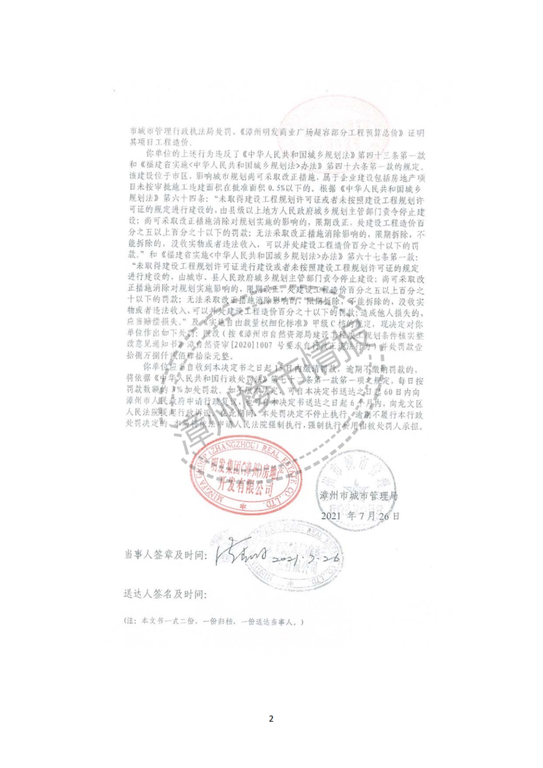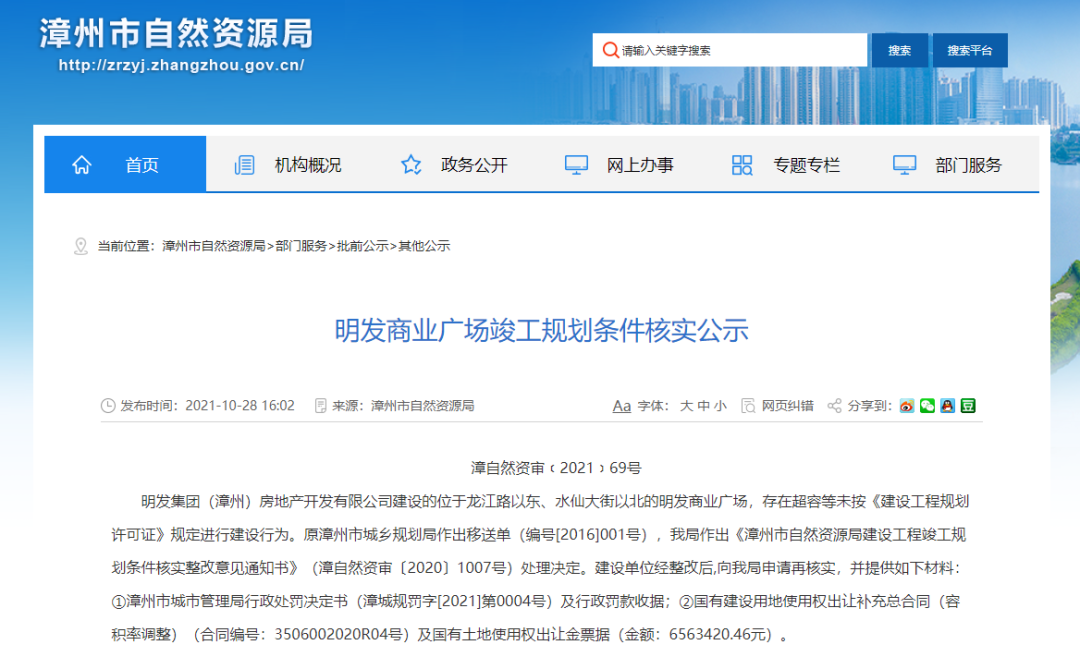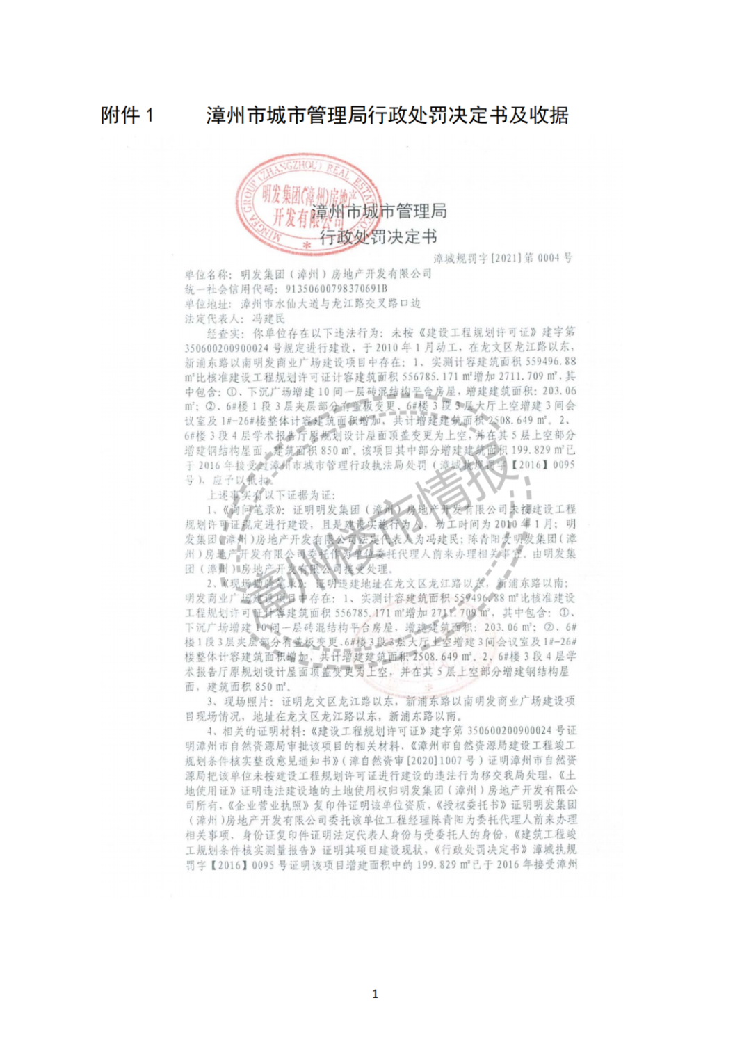 明发商业广场竣工规划条件核实公示 漳自然资审﹝2021﹞69号 附件: 1.漳州市城市管理局行政处罚决定书及收据