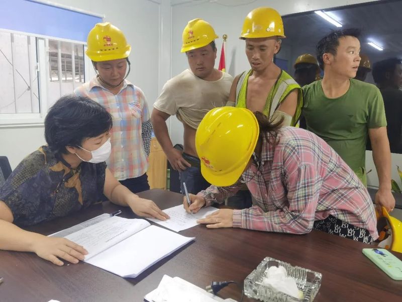 ▲图为市住建局工作人员随机抽查工地建筑工人询问工资发放情况