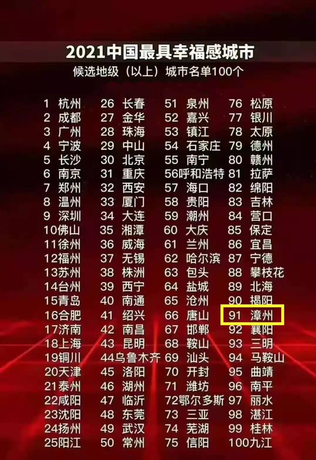 来源:赛迪顾问城市经济研究中心 近日,“2021中国最具幸福感城市”评选结果公布,漳州成功入选。“2021中国最具幸福感城市”调查推选活动以“百年红、幸福城”为主题,围绕让人民生活幸福是“国之大者”,以人民城市为人民、实现高质量发展为主线,对中国城市的幸福感进行调查,推介幸福城市建设的生动实践。该活动由新华社《瞭望东方周刊》、瞭望智库共同主办,至今已连续成功举办14年,累计推选出80余座幸福城市,“幸福城市”已成为新时代城市的名片和目标。