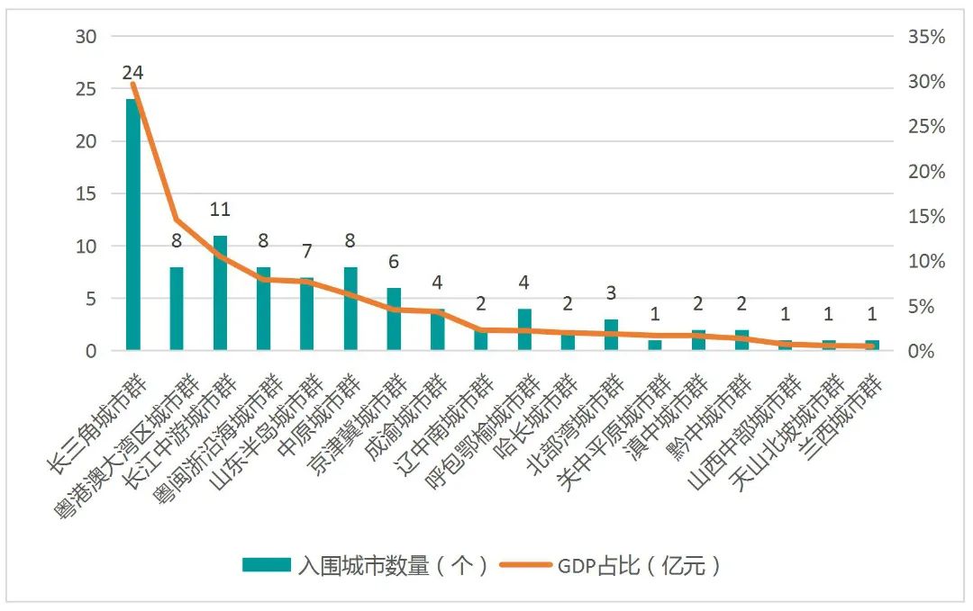 各城市群入围百强市城市数量及GDP占比