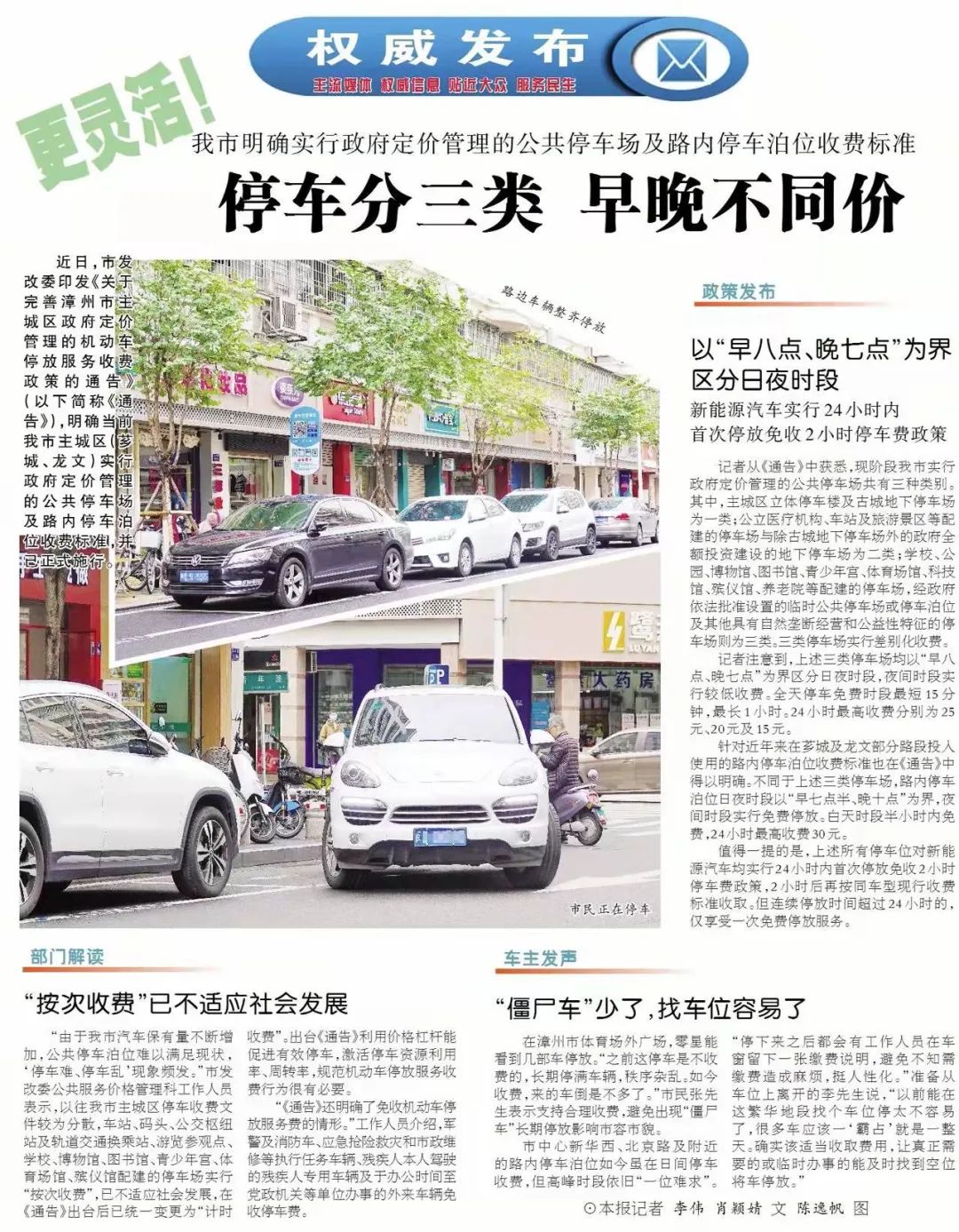 近日,市发改委印发《关于完善漳州市主城区政府定价管理的机动车停放服务收费政策的通告》(以下简称《通告》),明确当前我市主城区(芗城 、龙文)实行政府定价管理的公共停车场及路内停车泊位收费标准,并已正式施行。